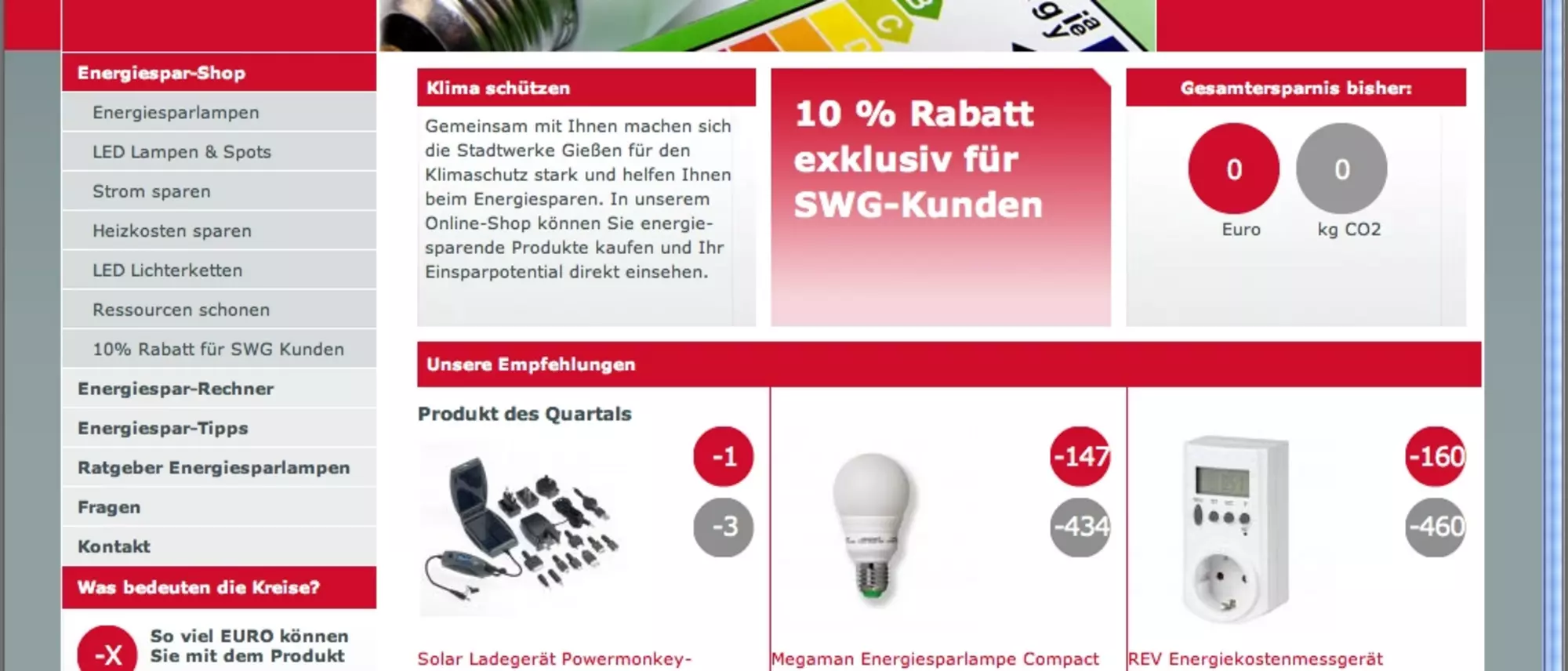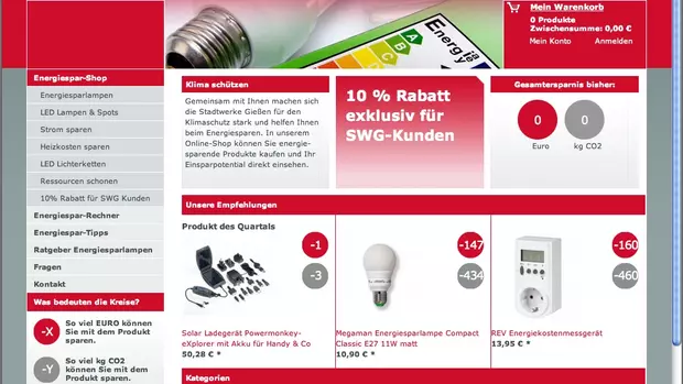 „Tipps zum Sparen geben unsere Energieberater am Gießener Marktplatz ja bereits seit Jahren und auch ein kleines Produktsortiment zum Energiesparen hatten wir immer vorrätig. Ab jetzt können wir unseren Kunden allerdings eine viel größere Auswahl energiesparender Produkte bieten“, erklärt SWG-Unternehmenssprecherin Ina Weller die Hintergründe. „Noch dazu können unsere Kunden bequem von zu Hause aus einkaufen.“