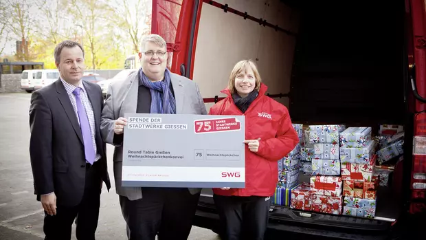 Some members of the Round Table and other volunteers accompany the lorry convoy to its destination in Romania. There, they personally distribute the gifts to children's homes, schools, nurseries and hospitals. Last year, Annette Leber, who works in the local transport department at Stadtwerke Gießen (SWG), took part for the first time. "Looking into the eyes of children beaming with joy really touched and overwhelmed me," says the SWG employee, describing her experiences. She was determined to support the campaign again in 2013. She also called on her colleagues to support the Christmas convoy. "We wanted 75 parcels - another good deed in the anniversary year of Stadtwerke Gießen," explains Annette Leber. On Wednesday 20 November, Annette Leber handed over the parcels and the symbolic donation cheque to Jens Ihle and Sven Lindemann. The two expressed their sincere thanks for the 75 parcels and the commitment of SWG and the SWG employees. "It's great that Stadtwerke Gießen is helping us with this campaign. We are proud to make such a great contribution to this project here in Giessen," emphasised Jens Ihle. He also called on people from Giessen and the surrounding area to follow Stadtwerke Giessen's example and take part in the Round Table's Christmas campaign themselves. "Presents for the children in need can be handed in at the Neils & Kraft distribution centre in Marburger Straße until 27 November."
