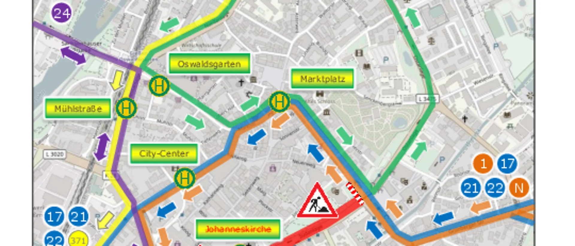 The stops "Nordanlage", "Oswaldsgarten", "Marktplatz", "Behördenzentrum" and "Landgericht" will be served. The stops "Mühlstraße", "Bahnhofstraße" and "Johanneskirche" will be cancelled.