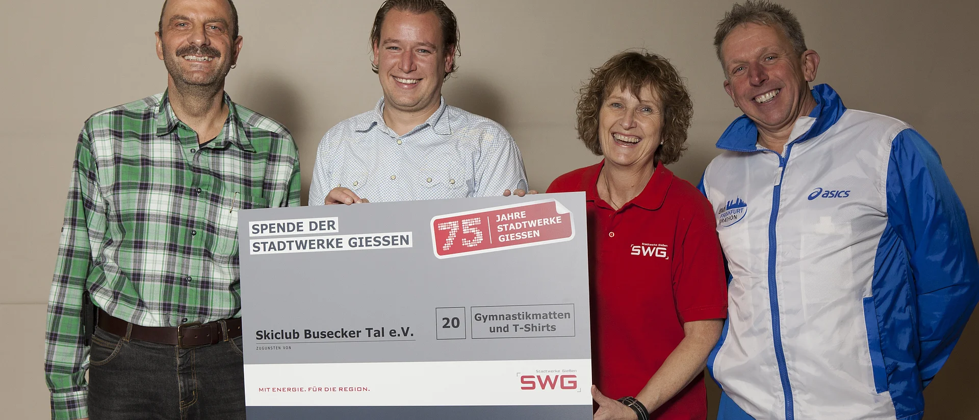 Каждую неделю в программу гимнастического курса также входят упражнения на полу. В базовую комплектацию входит подходящий спортивный мат. До недавнего времени членам клуба приходилось пользоваться изношенными матами в зале Вилли Чеха. Поскольку покупка новых матов была бы не по карману лыжному клубу, Клаудии Грюнбайн пришла в голову идея поддержать лыжный клуб одним из 75 добрых дел в юбилейный год Stadtwerke Giessen. В понедельник, 18 ноября, она вручила Тобиасу Фляйсснеру символический чек на пожертвование. Помимо спортивного инвентаря, SWG также спонсировала 20 футболок с надписью "Fit for Snow".
