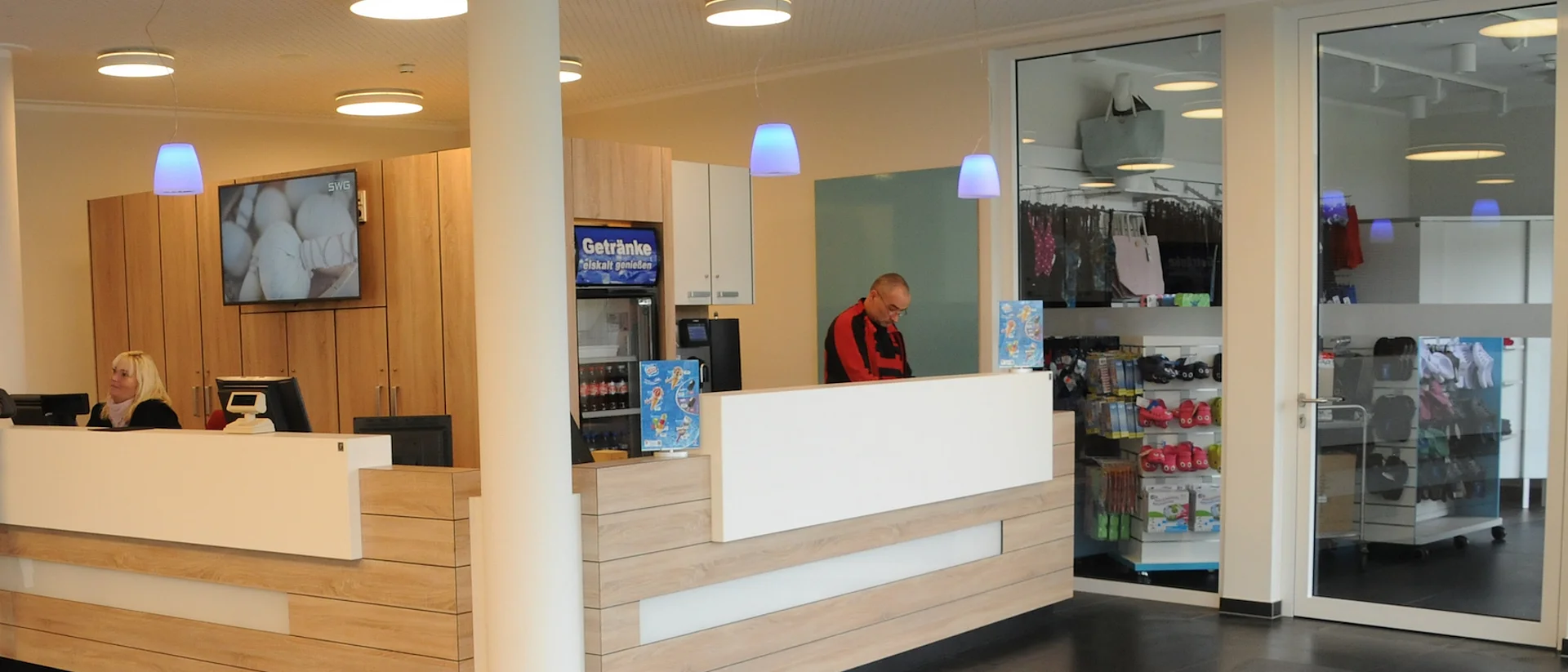 Еще один плюс: светлый и просторный магазин Beco справа от стойки регистрации. Здесь вы найдете всевозможные купальники, полотенца и полезные вещи - от плавательных средств для детей до обуви для плавания и очков для профессионалов. Наглядная информация и большой выбор.
